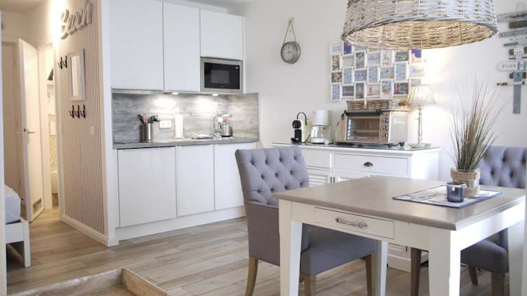 Die Ferienwohnung verfügt über ein Schlafzimmer, ein Badezimmer, Bettwäsche, Handtücher, einen Flachbild-TV mit Kabelkanälen, einen Essbereich sowie eine voll ausgestattete Küchenzeile. Ein Balkon mit Meerblick ist ebenfalls vorhanden.