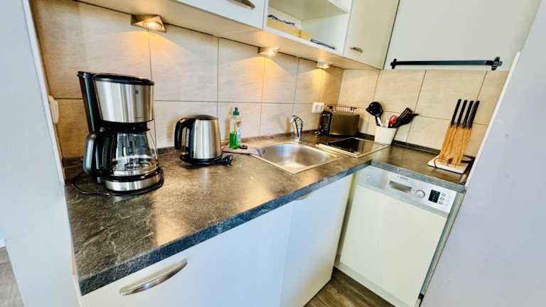 Eine gut ausgestattete Küchenzeile mit Kühlschrank, Geschirrspüler und Mikrowelle steht zur Verfügung, jedoch sind keine spezifischen Informationen zu Verpflegungsmöglichkeiten vorhanden.