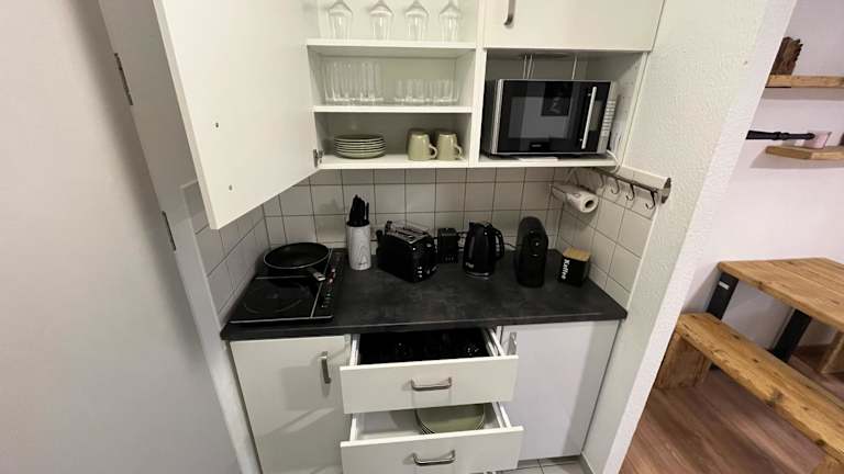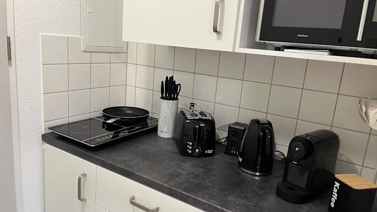 Die Ausstattung der Küche umfasst einen Kühlschrank, einen Ofen, Mikrowelle, Herdplatte, Toaster sowie eine Kaffeemaschine und einen Wasserkocher, um die Gäste bei der Selbstverpflegung zu unterstützen.