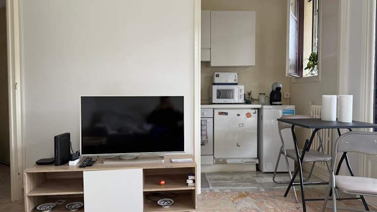 Das Studio verfügt über ein Schlafzimmer, ein Wohnzimmer mit Kabel-Flachbild-TV und eine voll ausgestattete Küchenzeile, die einen Kühlschrank umfasst.
