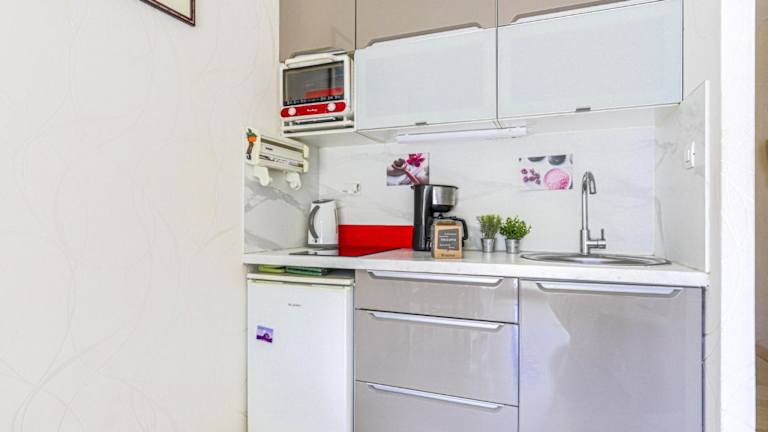 Die Ferienwohnung umfasst einen Essbereich, eine Küchenzeile mit einem Kühlschrank sowie Klimaanlage und Fernseher. Handtücher können gemietet werden, und es besteht die Möglichkeit, die eigene Bettwäsche mitzubringen.