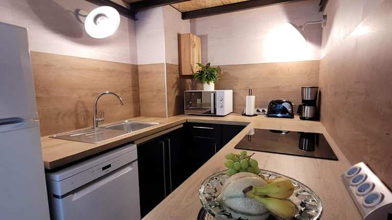 Die Ferienwohnung verfügt über eine voll ausgestattete Küche mit einem Kühlschrank und einer Kaffeemaschine, was eine Selbstverpflegung ermöglicht.