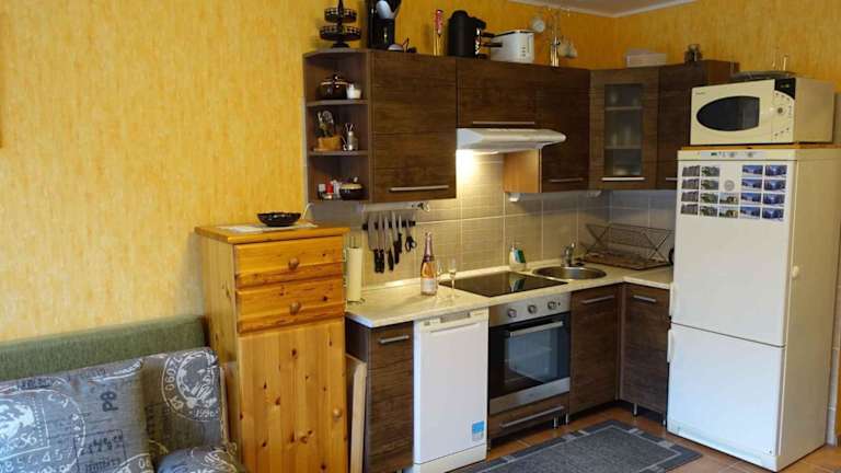 Die Unterkunft verfügt über eine Küche, die mit einem Kühlschrank, Geschirrspüler, Ofen, Kaffeemaschine und Wasserkocher ausgestattet ist, sodass die Gäste ihre eigenen Mahlzeiten zubereiten können.