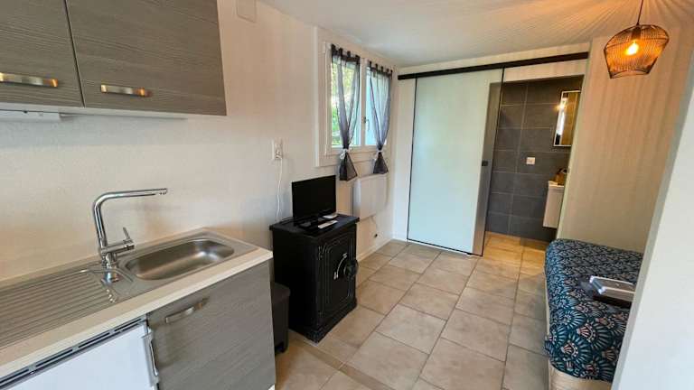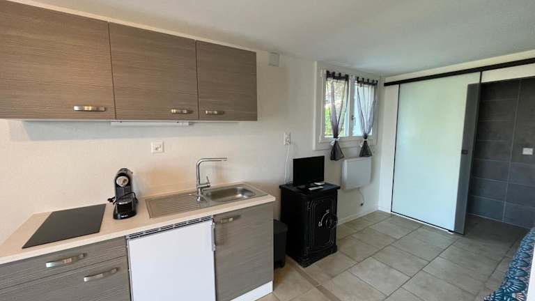 Das Studio Terrasse Vue Lac Entrée indépendante verfügt über eine gut ausgestattete Küchenzeile mit einem Kühlschrank, einem Kochfeld, einem Toaster, einer Kaffeemaschine und einem Wasserkocher. Das Studio bietet auch Kabel-TV und kostenfreies WLAN. Von der Terrasse aus können Sie den atemberaubenden Blick auf den See genießen.