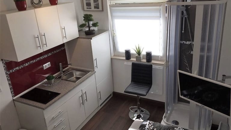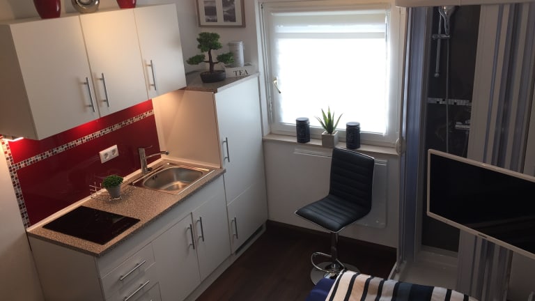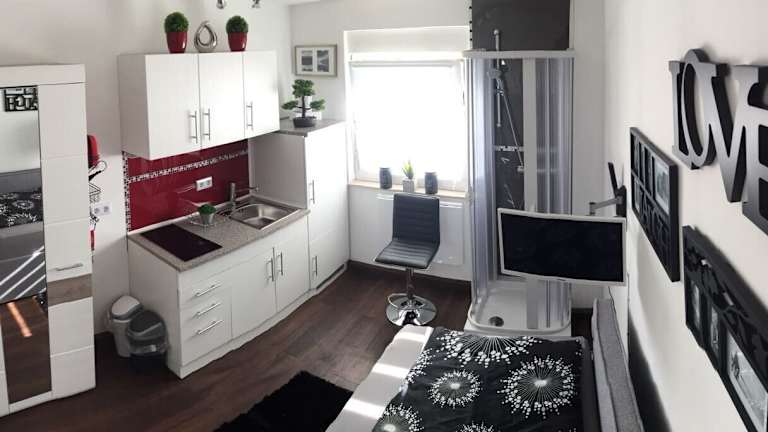 Das Apartment umfasst 1 Schlafzimmer, eine Küchenzeile mit Kühlschrank und Mikrowelle sowie 1 Badezimmer mit Dusche. Handtücher und Bettwäsche sind ebenfalls vorhanden.