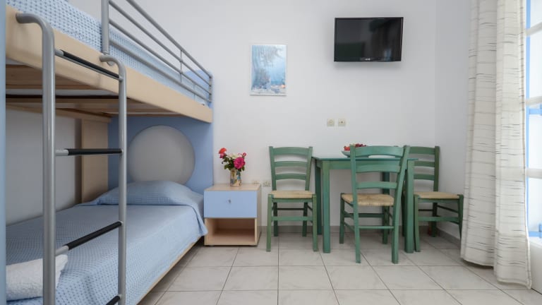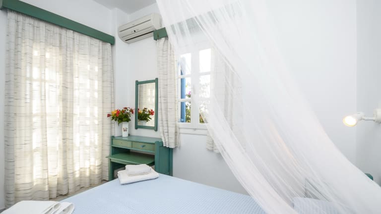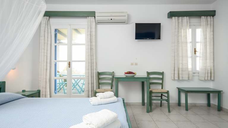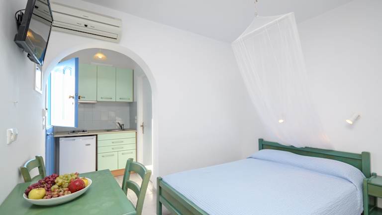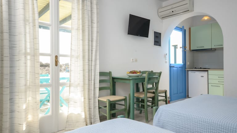 Die im traditionellen Stil der Kykladen gestalteten Studios und Apartments im Victoria bieten Ihnen eine gemütliche Unterkunft zur Selbstverpflegung. Jede Unterkunft verfügt über eine Küchenzeile mit Kühlschrank, Kochplatten und einem kleinen E-Herd. Die klimatisierten Zimmer öffnen sich zu einem Balkon oder einer Terrasse mit Meerblick. Zur Ausstattung gehören auch Sat-TV und ein eigenes Badezimmer mit Dusche und Haartrockner.