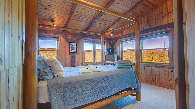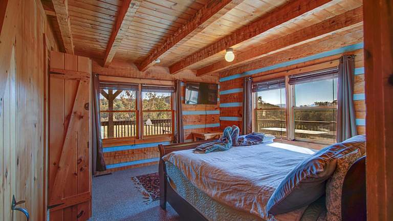 Die Hütte verfügt über ein Schlafzimmer und drei Badezimmer, die mit Dusche und Badewanne ausgestattet sind. Das Ferienhaus ist klimatisiert und bietet einen Flachbild-TV, einen Essbereich und eine voll ausgestattete Küche. Bettwäsche und Handtücher werden gestellt. Von der Terrasse aus können Sie den herrlichen Bergblick genießen.
