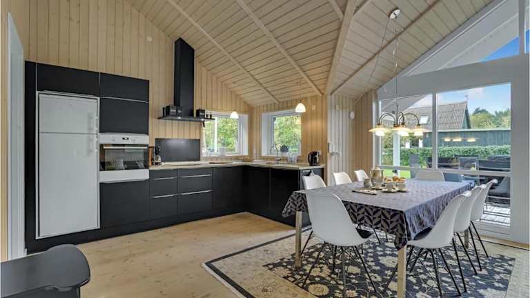In der voll ausgestatteten Küche des Ferienhauses stehen ein Kühlschrank und eine Kaffeemaschine zur Verfügung, um selbstständig Mahlzeiten zubereiten zu können.