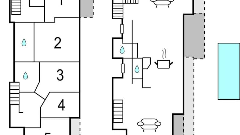 Das Ferienhaus verfügt über 5 Schlafzimmer, ein Wohnzimmer und eine voll ausgestattete Küche mit Kühlschrank und Kaffeemaschine. Es sind insgesamt 5 Badezimmer vorhanden, die mit einer Dusche und einer Badewanne ausgestattet sind.
