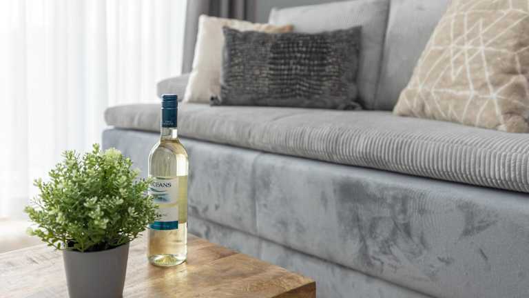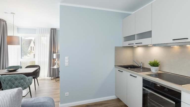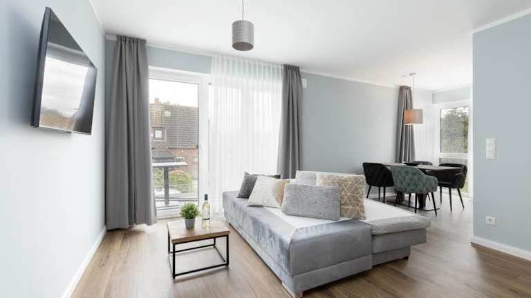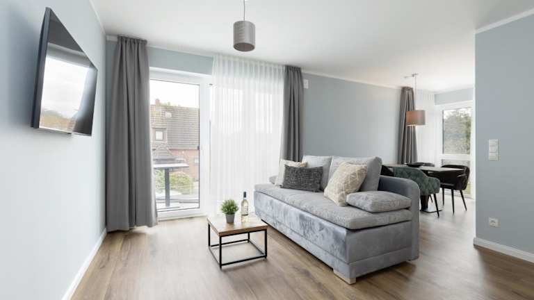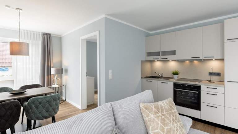 Die Ferienwohnung umfasst ein Schlafzimmer, ein Wohnzimmer und einen Balkon. Die Küche ist mit einem Geschirrspüler und einem Ofen ausgestattet.