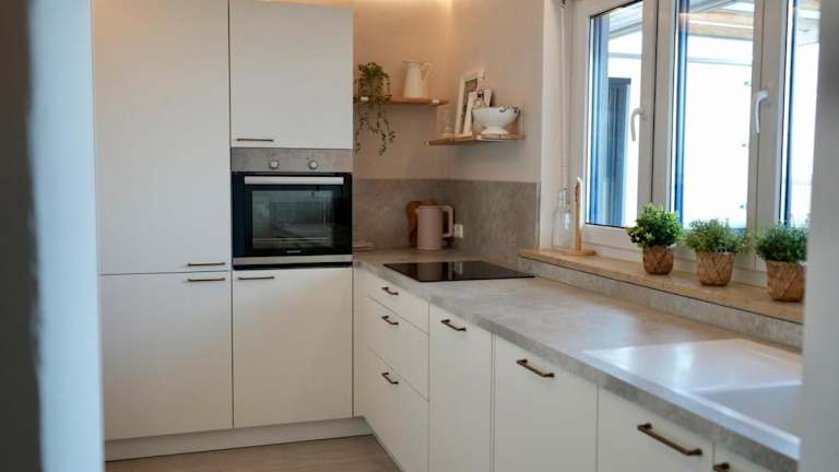 Eine eigene Küche ist in der Ferienwohnung vorhanden, ausgestattet mit einem Kühlschrank und einem Geschirrspüler. Es sind keine spezifischen Informationen zu weiteren Verpflegungsmöglichkeiten im Text enthalten.