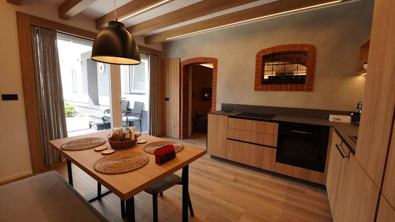 Die Ferienwohnung bietet eine voll ausgestattete Küche mit einem Kühlschrank und einer Kaffeemaschine. Keine weiteren Verpflegungsmöglichkeiten werden angegeben.