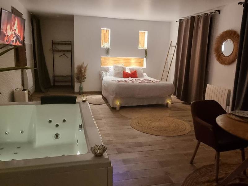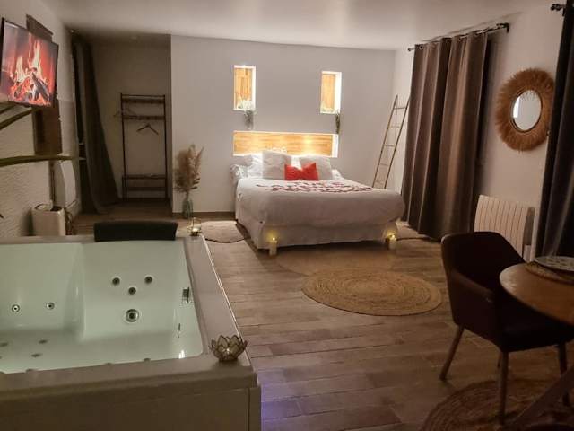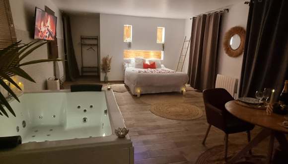 Die suite de charme avec jacuzzi privé L'évasion romantique ist eine ausschließlich für Erwachsene zugängliche Unterkunft, die in einer ruhigen Lage mit einem Garten, einer Terrasse und einer Bar eine entspannende Atmosphäre bietet. Die Unterkunft zeichnet sich durch Annehmlichkeiten wie einen Whirlpool, ein Spa-Center und kostenloses WLAN aus.