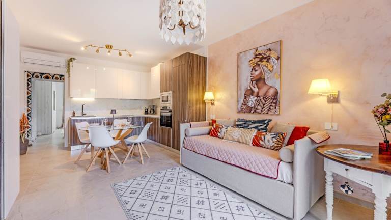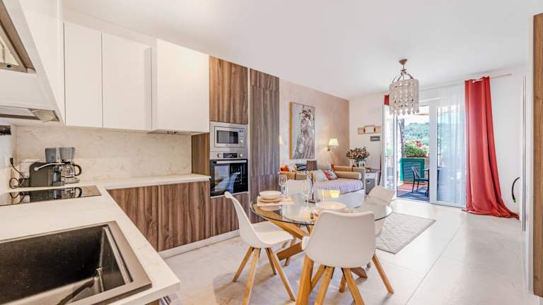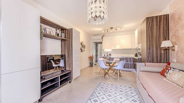 Die Ferienwohnung bietet Platz in einem Schlafzimmer sowie einem Wohnzimmer und umfasst ein Badezimmer mit Bidet und Dusche. Handtücher und Bettwäsche werden bereitgestellt, und es gibt eine Klimaanlage.