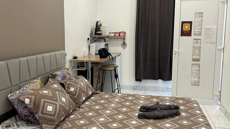 Die Ferienwohnung verfügt über ein klimatisiertes Schlafzimmer mit einem Badezimmer, das mit einer Dusche, einem Whirlpool sowie kostenlosen Pflegeprodukten ausgestattet ist. Eine Küchenzeile mit Kühlschrank, Mikrowelle und Kaffeemaschine ist ebenfalls vorhanden.