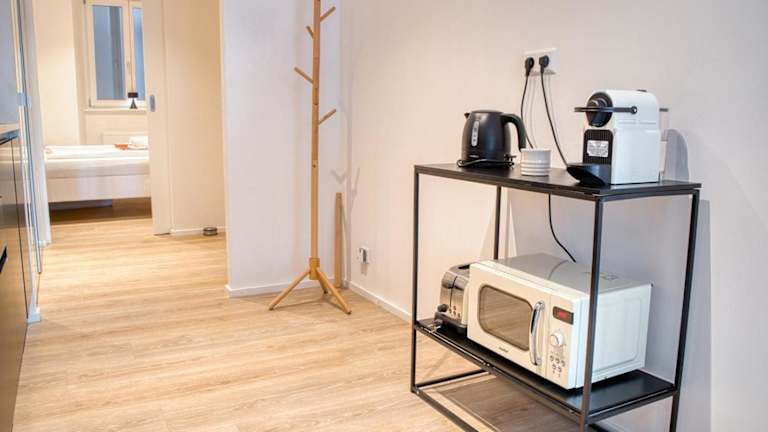 Die Ferienwohnung besteht aus einem Schlafzimmer, einem Wohnzimmer und einer voll ausgestatteten Küche mit Kühlschrank und Kaffeemaschine. Ein Badezimmer mit Dusche und kostenlosen Pflegeprodukten ist vorhanden. Handtücher und Bettwäsche werden bereitgestellt.