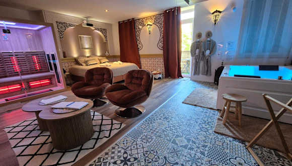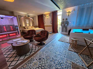 Die Suite Luxe Spa Balneo Sauna Hammam Projecteur ist eine klimatisierte Ferienwohnung, die über einen Balkon mit Stadtblick verfügt. Die Unterkunft bietet kostenloses WLAN in allen Bereichen und erstklassige Spa- und Wellnesseinrichtungen, darunter einen Whirlpool und eine Sauna. Die Unterkunft wird privat geführt und gehört nicht zu einer größeren Hotelkette.