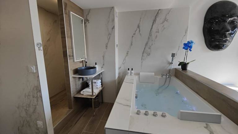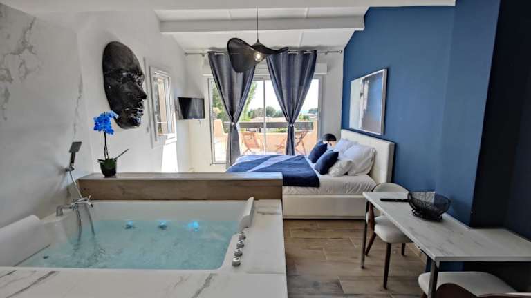 Das Suites JM - Les Pins Marines - Jacuzzi & Vue Mer ist ein charmantes Hotel in Bandol, nur wenige Gehminuten von den schönen Stränden Capelan und Engraviers entfernt. Die klimatisierten Unterkünfte bieten kostenfreies WLAN, eine Terrasse und eine Bar. Genießen Sie den Whirlpool im Apartment und erkunden Sie die Umgebung mit Aktivitäten wie Wandern, Tauchen und Angeln. Kostenlose Privatparkplätze stehen zur Verfügung.