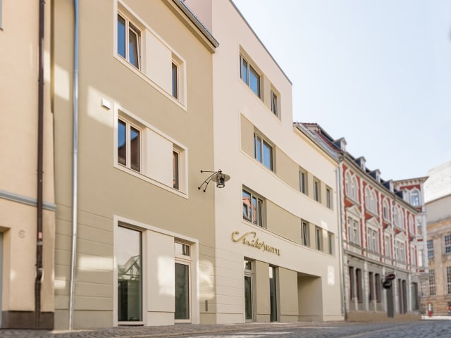 Apartments IN EISENACH. IM HERZEN DER ALTSTADT. Unser Aparthotel liegt im Herzen von Eisenach in einer ruhigen Seitengasse mit den Parkplätzen und Fahrradboxen direkt im Hof. Der Lift bringt Sie in eine der acht liebevoll eingerichteten und lichtdurchfluteten 2-Raum-Apartments mit Südbalkon für jeweils 1–4 Personen. Erwarten Sie ein exklusives Wohngefühl. Die Eichendielen in den Apartments verströmen Geborgenheit und ein Stück Natur, die großen Boxspringbetten sind der Platz für Träume – Designmöbel, bodengleiche Duschen, voll ausgestattete Küchen in jeder Suite und viele praktische Details runden das Wohlfühlkonzept ab. SERVICED APARTMENTS Der Servicefloor im 3. OG steht allen Gästen zur Verfügung. Hier finden Sie zu jeder Zeit ein kühles regionales Bier oder einen guten Wein. Aber auch Basics für Ihr individuelles Frühstück, Bücher, Kinderspiele oder Waschmaschine und Trockner. Frühstück im Schlafanzug? Kein Problem, die Brötchen sind schon da! Die Apartments sind besonders familienfreundlich und geeignet für Feriengäste, Städtereisende oder Geschäftsreisende – für länger oder auch nur für eine Übernachtung in Eisenach. Willkommen in Eisenachs Mitte. Willkommen in Suites MITTE. Das neu gebaute und im November 2018 eröffnete Aparthotel Suites MITTE verkörpert die moderne Generation des Wohnens auf Reisen. Erleben Sie die ausgeglichene Mischung der Flexibilität einer Ferienwohnung und den Annehmlichkeiten eines Hotels. Neben dem Gespür für komfortables Wohnen, stilvolles Design und vielseitigen Service wurde die Unterkunft zudem barrierreduziert und energieeffizient geplant.