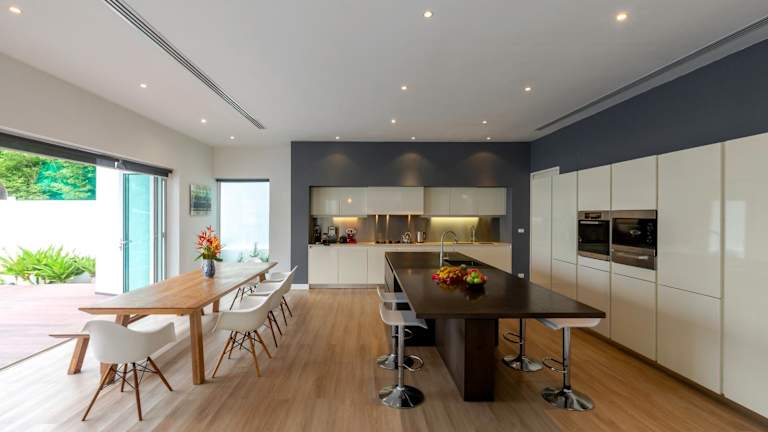Die Villa ist mit fünf Schlafzimmern und fünf Badezimmern ausgestattet. Zur weiteren Einrichtung gehören Bettwäsche, Handtücher, ein Flachbild-TV, ein Essbereich sowie eine voll ausgestattete Küche. Eine Terrasse mit Meerblick ergänzt die Ausstattung der Unterkunft.