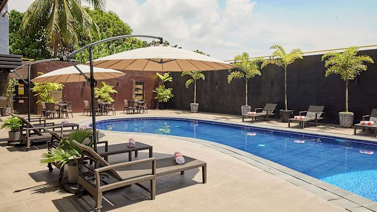 Die Gäste können den Außenpool des Hotels nutzen und sich entspannt am Poolbereich erholen.