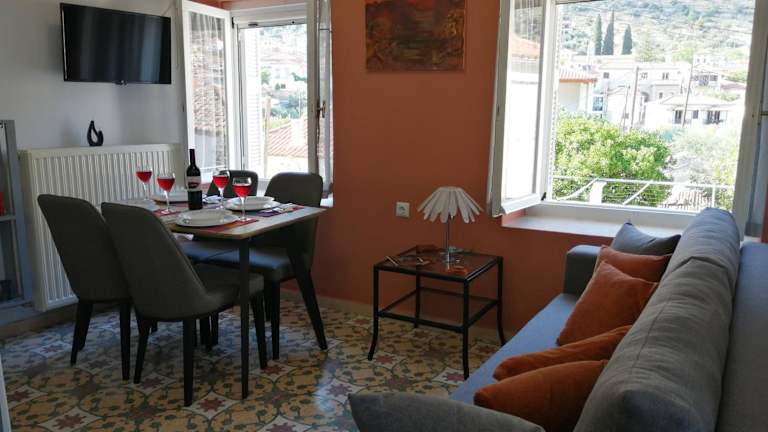 Das Sunny cozy House with grand Hof in Leonidion auf der Peloponnes ist eine gemütliche Unterkunft mit einem schönen Garten. Das klimatisierte Apartment bietet zwei Schlafzimmer, eine voll ausgestattete Küche und eine Terrasse mit Stadtblick. Kostenlose Privatparkplätze und WLAN sind ebenfalls vorhanden. Die Unterkunft liegt in der Nähe des Berges Parnon und ist ideal für einen erholsamen Aufenthalt in der Region Peloponnes.
