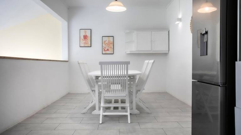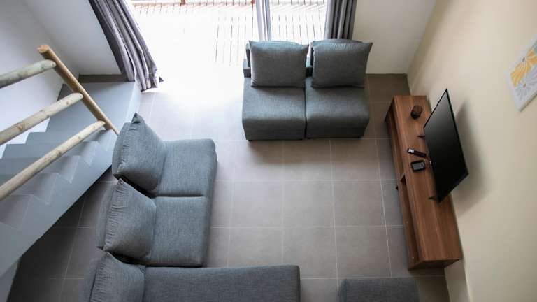 Die Ferienwohnung besteht aus zwei Schlafzimmern und einem Wohnzimmer. Zur Ausstattung gehören eine voll ausgestattete Küche mit Kühlschrank und Kaffeemaschine sowie zwei Badezimmer mit Dusche und Haartrockner. Klimaanlage, Handtücher und Bettwäsche sind ebenfalls vorhanden.