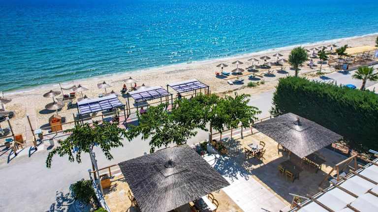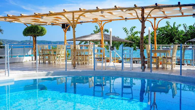 Im hoteleigenen Restaurant können Sie traditionelle Speisen aus Thasos probieren. Das Restaurant bietet eine fantastische Aussicht auf das Meer und ist der perfekte Ort, um die lokale Küche zu genießen. Die Bar des Hotels bietet Tische auf der Sonnenterrasse und am Meer, wo Sie einen erfrischenden Drink oder Cocktail genießen und die Aussicht auf das türkisfarbene Wasser bewundern können.