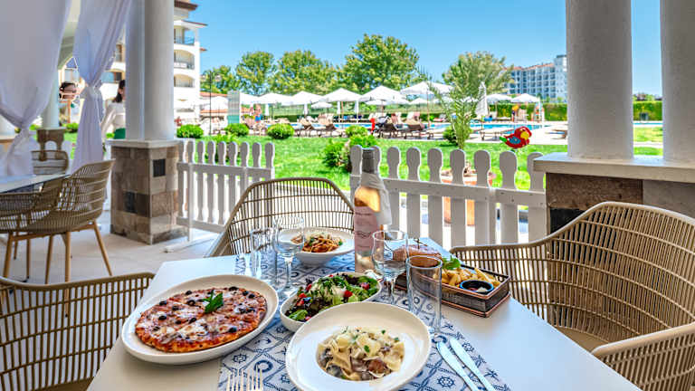 Kulinarische Vielfalt im Sunrise All Suites Resort Im stilvollen Hauptrestaurant genießen unsere Gäste täglich eine Auswahl an internationalen Gerichten in einem eleganten, modernen Ambiente. Wer lieber im Freien speist, kann das köstliche Buffet auch auf der sonnigen Terrasse mit herrlichem Blick auf den idyllischen Bioteich genießen. Das abwechslungsreiche Buffet überzeugt durch Frische, Qualität und Vielfalt – von Klassikern der internationalen Küche bis hin zu thematischen Highlights. Zweimal pro Woche überraschen wir Sie mit Themenabenden, z. B. mediterraner oder traditionell bulgarischer Küche. Für unsere kleinen Gäste stehen Hochstühle zur Verfügung. ☀️ Das Mittagessen im Hauptrestaurant ist von 12:30 Uhr bis 14:30 Uhr geöffnet. Neben einem Salatbuffet, Pizza und frischen Grillgerichten erwartet Sie täglich ein kulinarischer Sommergenuss. ⏰ Öffnungszeiten: Mittagessen: 12:30 – 14:00 Uhr Abendessen: 18:00 – 21:00 Uhr À-la-carte-Genuss – inklusive Das elegante À-la-carte-Restaurant lädt mit mediterranem Flair und gemütlicher Atmosphäre zum Genießen ein. Feine Speisen der europäischen und internationalen Küche werden à la minute zubereitet – auf Wunsch vegetarisch oder mit regionalem Touch. Gäste mit All-inclusive-Aufenthalt können das À-la-carte-Restaurant einmal pro Aufenthalt (mind. 7 Nächte) ohne Aufpreis für ein stilvolles Abendessen nutzen. Ebenso steht das À-la-carte-Restaurant täglich von 12:30 bis 15:00 Uhr (1. Juni – 31. August) zum Mittagessen offen – als köstliche Alternative zum Buffet, serviert nach Wahlmenü. ⏰ Öffnungszeiten: Mittagessen: 12:30 – 15:00 Uhr Abendessen: 18:00 – 21:00 Uhr Reservierung für das Abendessen erforderlich.
