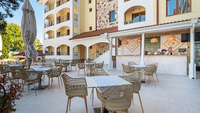 Sunrise All Suites Resort bietet seinen Gästen stilvolle Apartments und Zimmer, die sich in vier Gebäuden befinden. (Die Zimmer befinden sich nur im Gebäude 2, in dem es keine Apartments gibt.) Das Hauptrestaurant ist der Ort, wo Sie in einem angenehmen Ambiente die Vielfalt der bulgarischen und der internationalen Küche genießen werden. Das A-la-Cart-Restaurant, das in sich die Atmosphäre der Meeresbrise mit Gemütlichkeit und Sommerstimmung verbindet, wird internationale Speisen anbieten, die charmant mit Lächeln und geschickt serviert werden. Der Snack Corner mit Blick auf dem Bioteich ergänzt den kulinarishcen Auswahl unserer Gäste. Im Komplex finden Sie noch drei große Swimmingpools und drei für Kinder, alle mit Süßwasser, einen natürlichen Biosee, einen Kinderspielplatz im Freien, eine Kinderecke zum Spielen und Austoben, eine Konditorei Cafe-Bar, einen Snack Corner, Geschäfte. Zusätzliche Bequemlichkeiten in Sunrise All Suites Resort sind ein kostenloser bewachter Parkplatz mit über 70 Autoparkstellen, kostenloses WLAN im ganzen Komplex. Für die Freunde von dem aktiven Urlaub bieten wir Leihfahrräder für lange Spaziergänge inmitten der unberührten Natur der Umgebung. !!! NEU: Ab Saison 2021 - Strandbar (ab 1 Juni bis 31 August - inklusive 10:00-18:00Uhr)