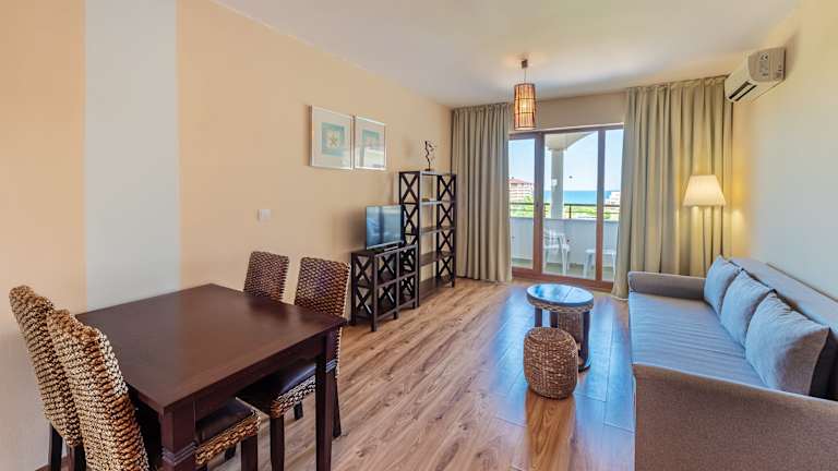 Doppelzimmer Erleben Sie Komfort und Entspannung in unseren stilvoll gestalteten Doppelzimmern – harmonisch eingerichtet in beruhigenden Meeres- und Sandtönen. Mit 28 m² Wohnfläche sind sie Teil unseres familienfreundlichen Konzepts und bieten den idealen Rahmen für einen unbeschwerten Urlaub am Meer. Perfekt geeignet für Familien (2 Erwachsene + 2 Kinder oder 3 Erwachsene), verfügen die Zimmer über zwei reguläre Betten sowie ein drittes Bett oder ein Schlafsofa (140 × 200 cm). Zur Ausstattung gehören: Minikühlschrank, Kaffee- oder Wasserkocher, Dusche/WC, Föhn, Balkon, Klimaanlage, LCD-TV, kostenloses WLAN, Telefon und ein mietbarer Safe. Inklusive für unsere Gäste: Tägliche Auffüllung mit löslichem Kaffee und Tee Eine Thermoskanne Zimmer mit Bergblick oder seitlichem Meerblick verfügbar. Mindestbelegung: 2 Vollzahler Maximalbelegung: 2 Erwachsene + 2 Kinder oder 3 Erwachsene Appartement mit einem Schlafzimmer Unsere 63 m² großen Apartments mit einem Schlafzimmer vereinen Raum, Design und Funktionalität – ideal für Familien oder Freundesgruppen, die eine entspannte Auszeit an der Küste suchen. Die stilvolle Einrichtung in sanften Naturtönen bringt maritime Gelassenheit in jedes Detail. Die Apartments bieten ein separates Schlafzimmer und ein helles Wohnzimmer mit Kochnische und Essbereich. Zur Ausstattung zählen: Kühlschrank, Kaffee- oder Wasserkocher, Backofen, Waschmaschine, Bad oder Dusche/WC, Föhn, Balkon, Klimaanlage, LCD-TV, kostenloses WLAN, Telefon und ein mietbarer Safe. Zusatzbetten befinden sich im Wohnzimmer: entweder ein Schlafsofa (140 × 190 cm) oder zwei einzelne Liegesessel (80 × 190 cm). Inklusive für unsere Gäste: Tägliche Auffüllung mit löslichem Kaffee und Tee Apartments mit Bergblick oder seitlichem Meerblick verfügbar. Mindestbelegung: 2 Vollzahler Maximalbelegung: 2 Erwachsene + 2 Kinder oder 3 Erwachsene Appartement mit zwei Schlafzimmern Ideal für größere Familien oder Freundesgruppen – unsere 90 m² großen Apartments mit zwei Schlafzimmern bieten großzügigen Raum, stilvolles Interieur und höchsten Wohnkomfort. Die Einrichtung kombiniert warme Naturmaterialien mit dezenten Meeres- und Wasserelementen für ein natürliches Wohlfühlambiente. Zur Ausstattung gehören zwei separate Schlafzimmer und ein geräumiges Wohnzimmer mit Kochnische und Essbereich. Darüber hinaus: Kühlschrank, Kaffee- oder Wasserkocher, Backofen, Waschmaschine, Bad oder Dusche/WC, zusätzliches WC, Föhn, Balkon, Klimaanlage, LCD-TV, kostenloses WLAN, Telefon und ein mietbarer Safe. Die Zusatzbetten im Wohnzimmer bestehen wahlweise aus einem Schlafsofa (140 × 190 cm) oder zwei einzelnen Liegesesseln (80 × 190 cm). Inklusive für unsere Gäste: Tägliche Auffüllung mit löslichem Kaffee und Tee Apartments mit Bergblick oder seitlichem Meerblick verfügbar. Mindestbelegung: 4 Vollzahler Maximalbelegung: 4 Erwachsene + 2 Kinder oder 5 Erwachsene
