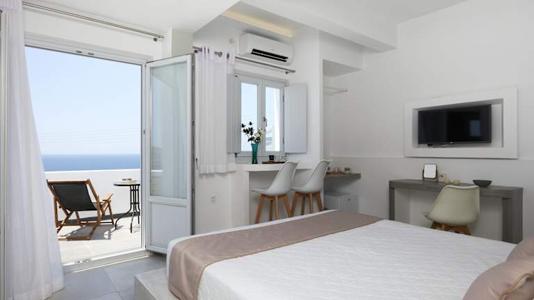Die Zimmer im Sunset Faros sind klimatisiert und bieten Annehmlichkeiten wie einen Kleiderschrank, einen Wasserkocher, einen Kühlschrank, einen Safe, einen Flachbild-TV und ein eigenes Badezimmer mit Dusche. Einige Zimmer verfügen über einen Balkon oder eine Terrasse und bieten einen herrlichen Blick auf das Meer. Bettwäsche und Handtücher werden gestellt.