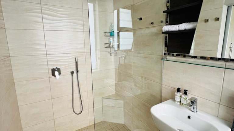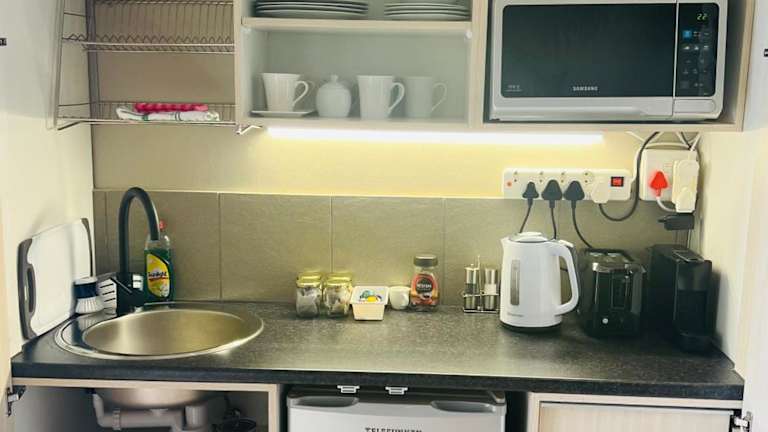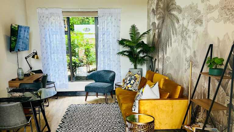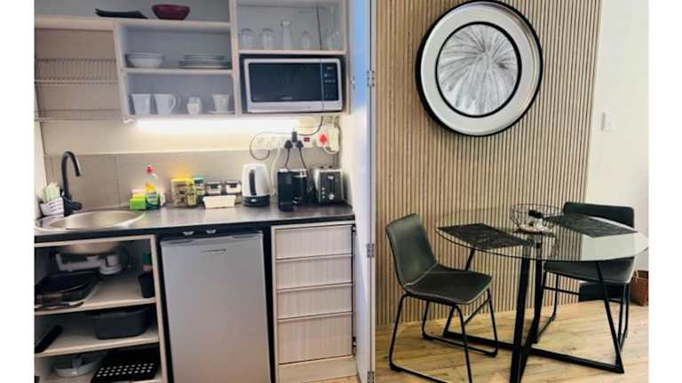 Das Apartment verfügt über ein gemütliches Schlafzimmer, eine praktische Küchenzeile mit Kühlschrank und Mikrowelle, einen Flachbild-TV und einen komfortablen Sitzbereich. Das Badezimmer ist mit einer Dusche ausgestattet. Handtücher und Bettwäsche werden gestellt, um Ihren Aufenthalt so angenehm wie möglich zu gestalten.