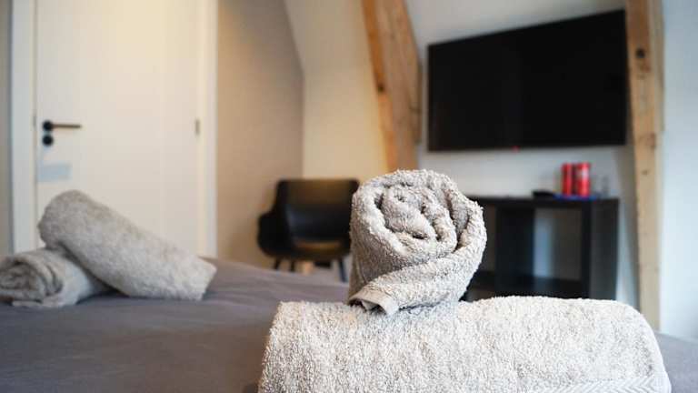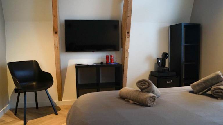 Das Super de luxe privékamer op een toplocatie - Zimmer 1 bietet ein komfortables und stilvolles Zimmer mit einem Flachbild-TV. Handtücher und Bettwäsche werden gestellt, um den Aufenthalt der Gäste so angenehm wie möglich zu gestalten. Das Zimmer bietet eine gemütliche und private Atmosphäre für einen entspannten Strandurlaub.