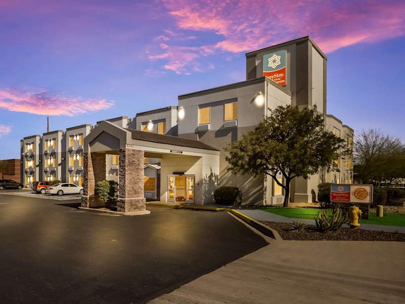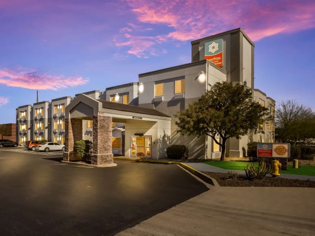 Das Surestay Plus Hotel by Best Western Superstition Springs bietet seinen Gästen eine ideale Lage in Mesa, in der Nähe von Tempe, Scottsdale, Chandler, Gilbert, Apache Junction und Phoenix. Das Hotel befindet sich auf dem Gelände des Superstition Springs Centers und bietet über 150 Geschäfte in unmittelbarer Nähe. Die Gäste können von Annehmlichkeiten wie einem kostenlosen Frühstücksbuffet und rund um die Uhr verfügbarem Kaffee und Tee profitieren. Zusätzliche Annehmlichkeiten umfassen eine kostenlose Zeitung, kostenlose Ortsgespräche, einen beheizten Außenpool und einen Whirlpool. Geschäftsreisende werden die Annehmlichkeiten wie kostenloses WLAN, ein Businesscenter und Zugang zu Kopier- und Faxdiensten zu schätzen wissen. Alle Zimmer sind mit Kaffeemaschinen, Haartrocknern, Bügeleisen, Bügelbrettern und Kühlschränken ausgestattet. Auf dem Gelände befinden sich ein Zeitungskiosk und eine Gästewaschküche. In der Umgebung gibt es eine Vielzahl von Restaurants und Geschäften. Das Restaurant 5 & Diner, das sich nebenan befindet, bietet auch einen Zimmerservice. Darüber hinaus ist das Hotel in der Nähe von Sehenswürdigkeiten wie dem Casino Arizona, der Arizona State University, der Talking Stick Resort Arena, dem Chase Field, dem Phoenix Zoo und dem Desert Botanical Garden. Freizeit World Arizona, das Mesa Amphitheatre, Salt River Canyon und das Boyce Thompson Arboretum, Sloan Park und Hohokam Stadium sind ebenfalls in der Nähe. Der internationale Flughafen Phoenix Sky Harbor ist 32 km vom Hotel entfernt.
