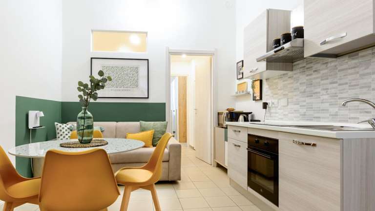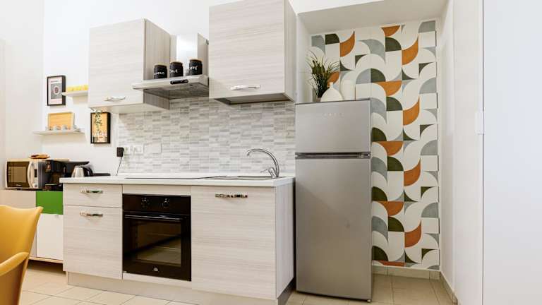 Die Ferienwohnung besteht aus einem Schlafzimmer, einem Wohnzimmer, sowie einer voll ausgestatteten Küche, die unter anderem einen Kühlschrank und eine Kaffeemaschine umfasst. Des Weiteren gibt es ein Badezimmer mit einem Bidet und einer Dusche. Handtücher und Bettwäsche sind ebenfalls vorhanden.