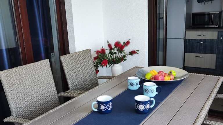 Die Ferienwohnung verfügt über 2 Schlafzimmer und 1 Badezimmer. Zur Ausstattung gehören Bettwäsche, Handtücher, ein Flachbild-TV mit Kabelkanälen, ein Essbereich, eine voll ausgestattete Küche sowie eine Terrasse mit Meerblick.