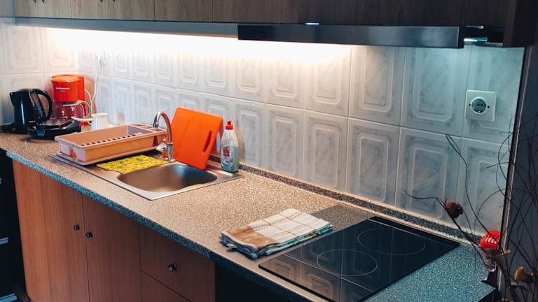 Die Ferienwohnung umfasst ein Schlafzimmer, ein Wohnzimmer sowie eine voll ausgestattete Küche mit Kühlschrank und Kaffeemaschine. Des Weiteren gibt es ein Badezimmer mit Bidet und Dusche. Handtücher und Bettwäsche werden in der Unterkunft bereitgestellt.
