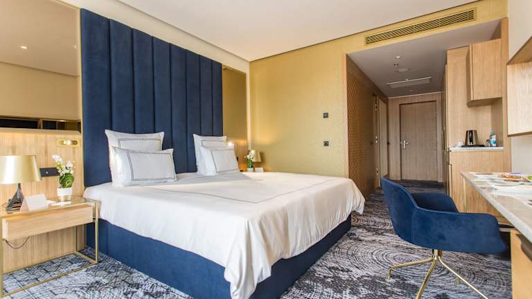 Die Zimmer sind mit Teppichböden ausgestattet und verfügen über eine Klimaanlage sowie Heizung. Zur Ausstattung gehören ein Doppelbett, ein Kingsize-Bett oder ein Sofabett, ein Safe, eine Minibar und ein Schreibtisch. Eine Tee- und Kaffeemaschine sowie ein Flachbildfernseher sind ebenfalls Teil der Einrichtung. Die Badezimmer sind mit einer Dusche, Haartrockner, Bademänteln und Kosmetikartikeln ausgestattet. Zudem sind barrierefreie Zimmer verfügbar.