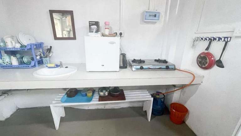 Das Zimmer ist klimatisiert und verfügt über einen Essbereich sowie eine voll ausgestattete Küche mit Kühlschrank. Handtücher und Bettwäsche werden bereitgestellt.