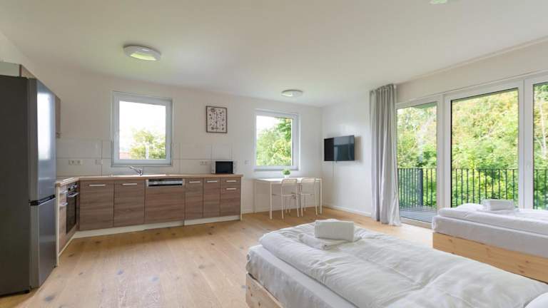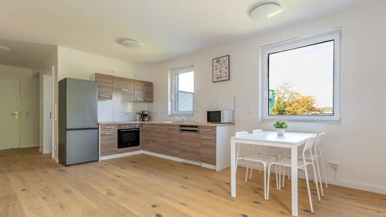 Die Apartments sind mit einer voll ausgestatteten Küche versehen, die einen Kühlschrank, Geschirrspüler, Ofen, Mikrowelle, Herdplatte, Kaffeemaschine und Wasserkocher umfasst.