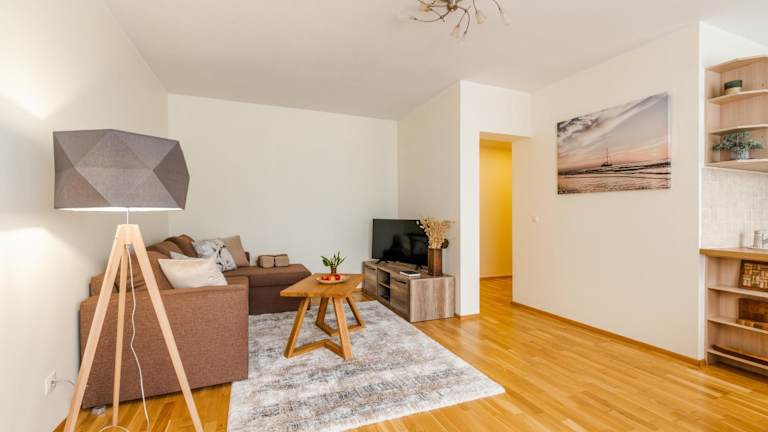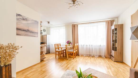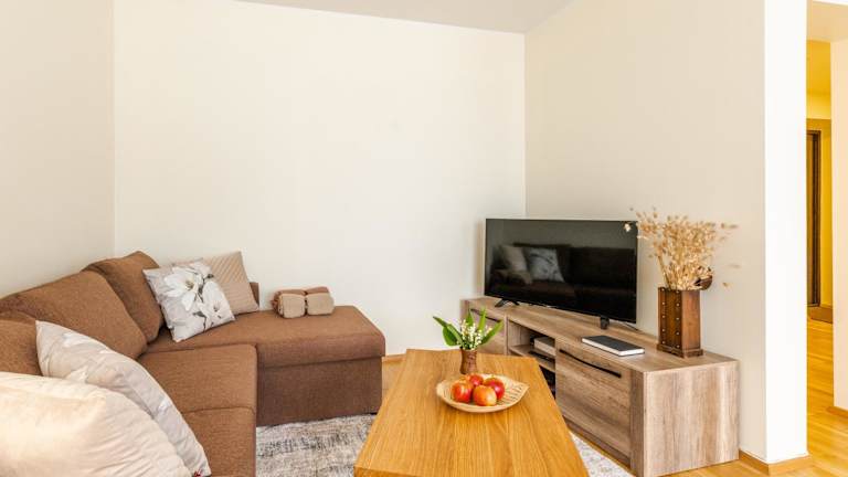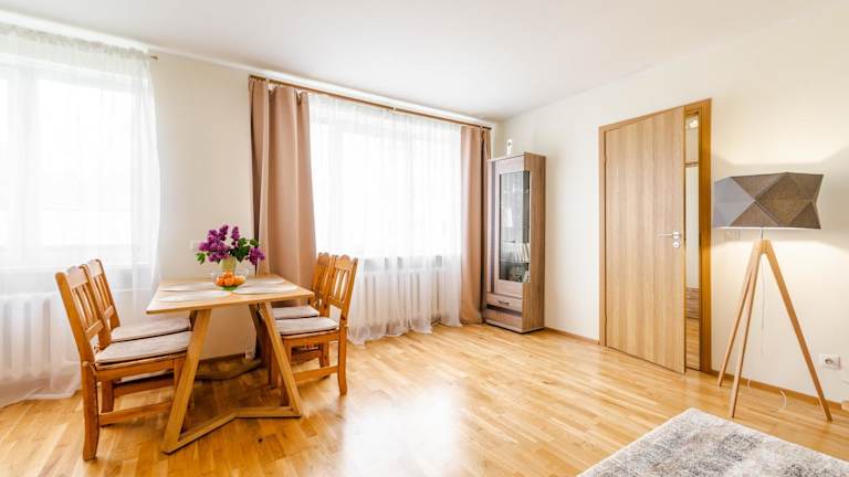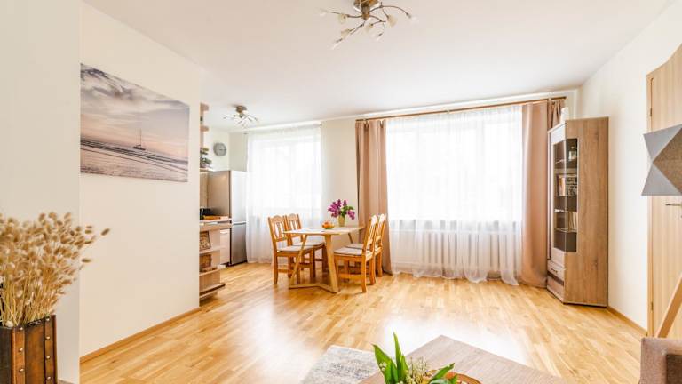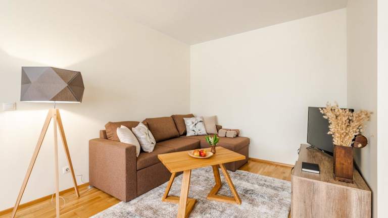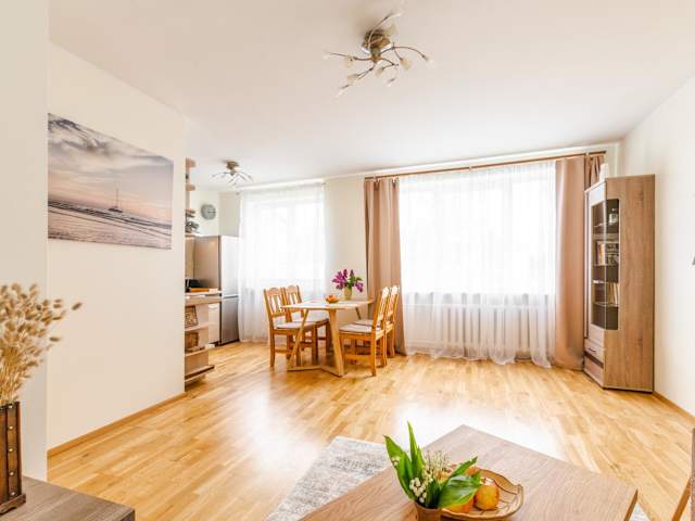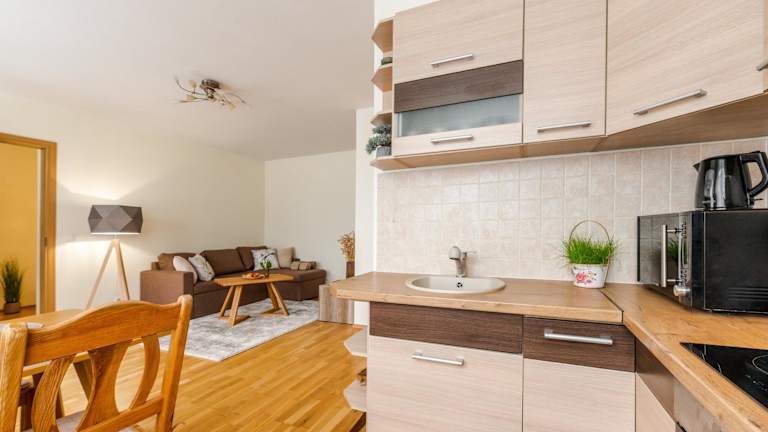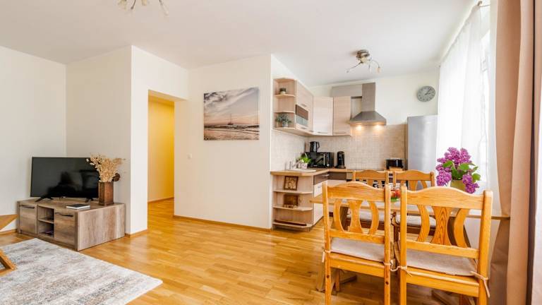 Das Apartment verfügt über ein gemütliches Schlafzimmer, ein Wohnzimmer und eine voll ausgestattete Küchenzeile. In der Küchenzeile finden Sie einen Kühlschrank und eine Kaffeemaschine. Das Badezimmer ist mit einer Dusche und kostenlosen Pflegeprodukten ausgestattet. Handtücher und Bettwäsche werden im Apartment gestellt.