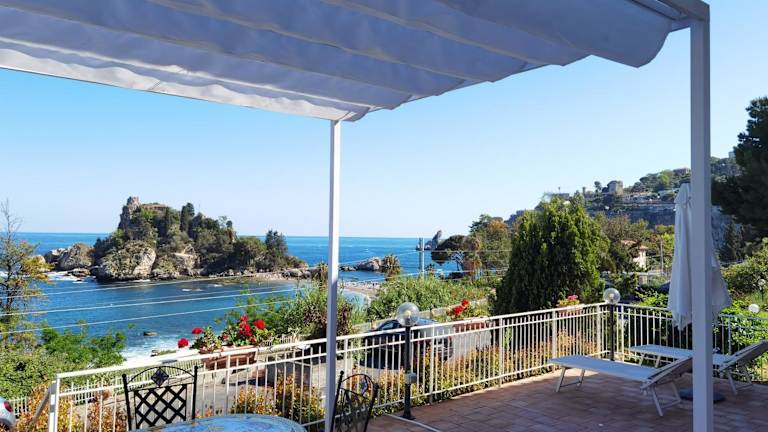 Das Taormina Isola Bella Apartment - Taormina Holidays bietet einen Blick auf die Stadt und verfügt über einen Balkon. Die Unterkunft ist direkt am Strand gelegen und bietet Zugang zu einer Terrasse sowie kostenfreiem WLAN und persönlichem Parkplatz.