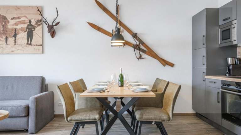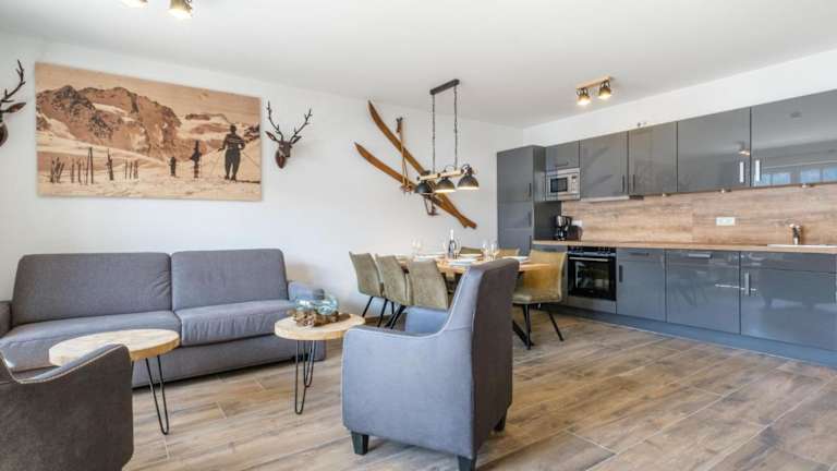 Die Ferienwohnung umfasst einen Balkon, ein Schlafzimmer, ein Wohnzimmer sowie eine gut ausgestattete Küche mit Kühlschrank und Geschirrspüler. Handtücher und Bettwäsche werden bereitgestellt.