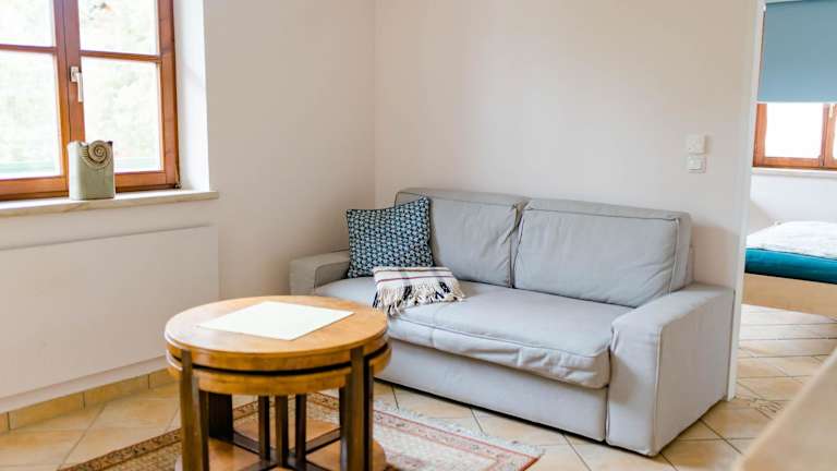 Die Ferienwohnung besteht aus einem Schlafzimmer, einem Wohnzimmer und einer voll ausgestatteten Küche mit Kühlschrank und Kaffeemaschine. Das Badezimmer ist mit einer Badewanne und einem Haartrockner ausgestattet. Handtücher und Bettwäsche werden bereitgestellt.