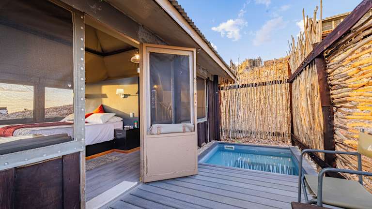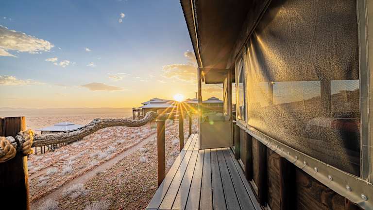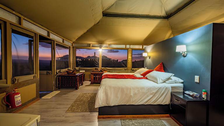 Die Tented Moon Mountain Lodge befindet sich im Namib Naukluft Park, etwa 56 km von Sesriem entfernt. Die Lodge liegt in der Nähe der roten Sanddünen von Sossusvlei und ist in der Umgebung der Moon Mountains eingebettet. Die ruhige Lage ermöglicht die Erkundung der einzigartigen Tierwelt dieser Wüstenregion. Solitaire liegt ca. 30 km in südlicher Richtung, und der Flughafen Hosea Kutako International Airport befindet sich etwa 323 km entfernt.
