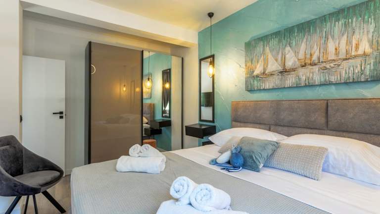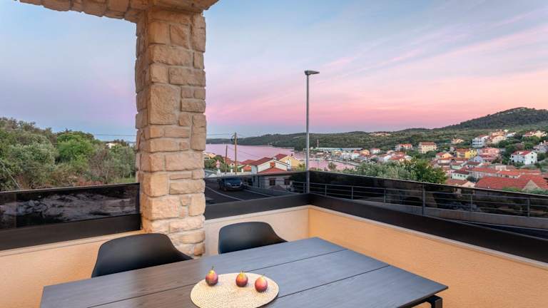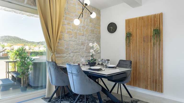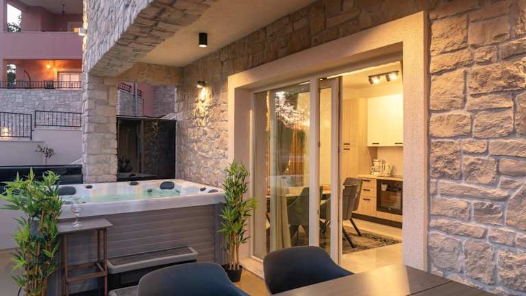 Die TEONA Luxury Apartment with jacuzzi and terrace sea view bietet Übernachtungsmöglichkeiten in einer komfortablen Ferienwohnung mit Terrasse, die einen Blick auf die Stadt ermöglicht. WLAN-Access ist kostenlos verfügbar, und es gibt einen Garten sowie kostenlose Parkmöglichkeiten vor Ort.