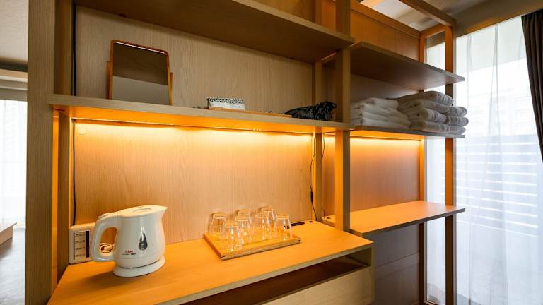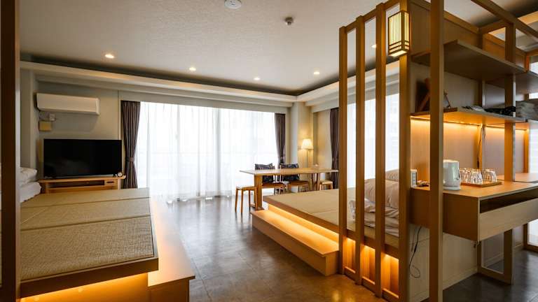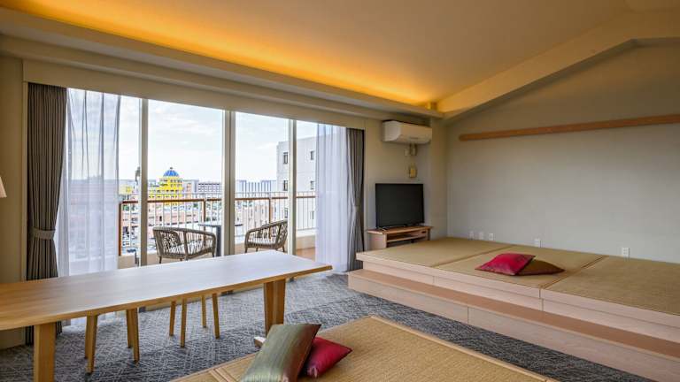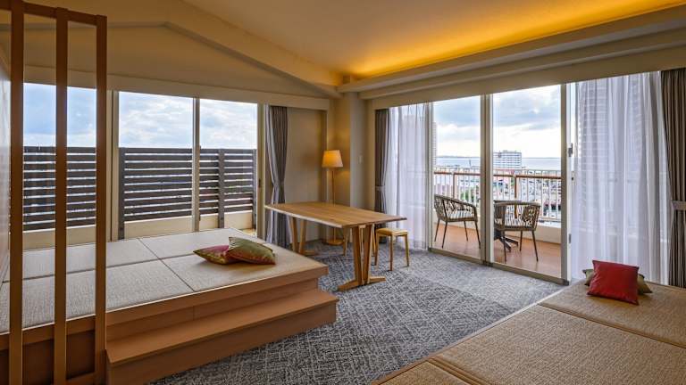 Die Zimmer im Terrace Garden Mihama Resort sind geräumig und bieten einen herrlichen Meerblick. Mit einer Größe von 100 m2 bieten sie viel Platz zum Entspannen und verfügen über einen komfortablen Sitzbereich mit Sofa. Zur Ausstattung gehören ein Flachbild-TV, ein Kühlschrank und ein Wasserkocher mit grünem Tee. Jedes Zimmer verfügt über einen Balkon und einen großen Relaxsessel. Das eigene Badezimmer ist mit einer Whirlpool-Badewanne und einer Dusche ausgestattet.