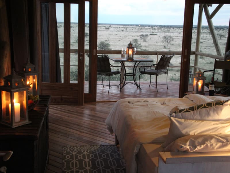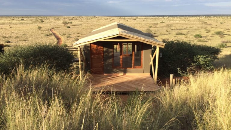 Die sechs modernen und großzügigen Zelthäuser sind komfortabel und sehr geschmackvoll möbliert. Zelt und Glas sind die bestimmenden Elemente und machen das Übernachten auf der ersten und westlichsten Düne der Kalahari erlebbar. Sie verfügen über ein eigenes Bad mit Dusche und WC, welches über einen Holzsteg erreicht wird. Die Zelthäuser sind mit einem Kühlschrank und einer Minibar ausgestattet