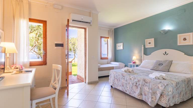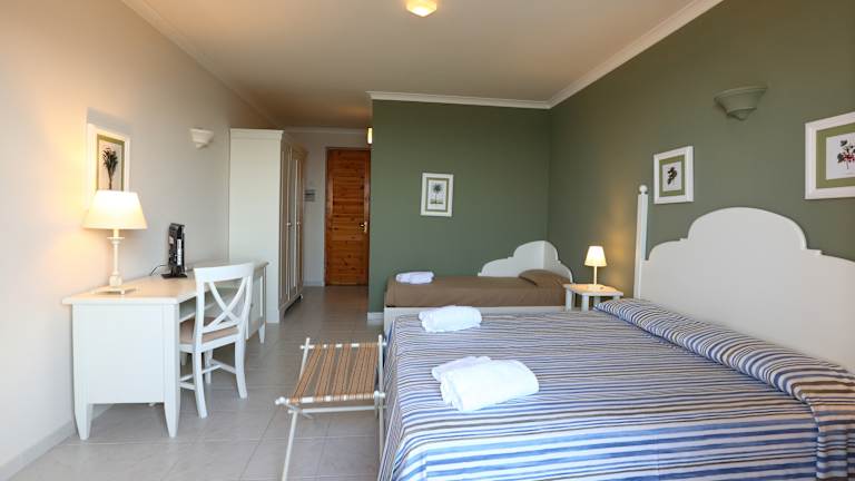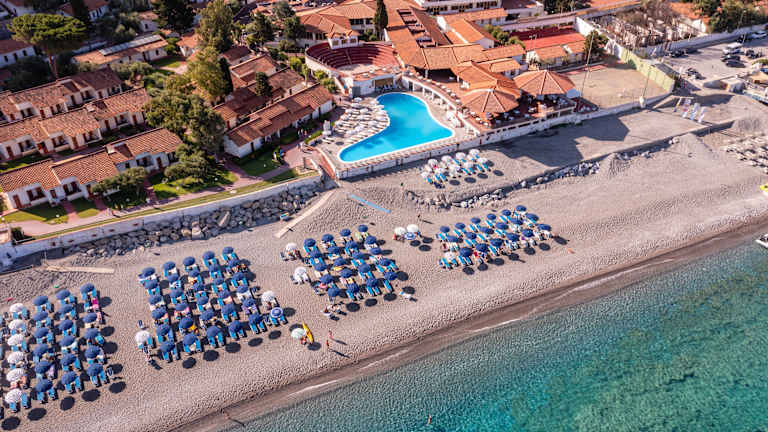 Das Resort verfügt über 288 Zimmer in verschiedenen Kategorien, teilweise mit Meerblick: Doppel-, Dreibett-, Vierbettzimmer sowie großzügige Familienzimmer für bis zu fünf Personen. Die Zimmer befinden sich sowohl im Hauptgebäude als auch entlang kleiner Wege, eingebettet in die mediterrane Vegetation. Alle Zimmer sind ausgestattet mit privatem Badezimmer mit Dusche und Haartrockner, Klimaanlage, TV, Safe, Telefon und Minibar (Auffüllung auf Anfrage gegen Gebühr). Zimmerkategorien: • Doppelzimmer – ideal für Paare • Dreibettzimmer – komfortable Lösung für kleine Familien • Vierbettzimmer – geeignet für Familien, mit Einzel- oder Etagenbetten • Fünfbettzimmer – großzügige Familienzimmer für bis zu 5 Personen